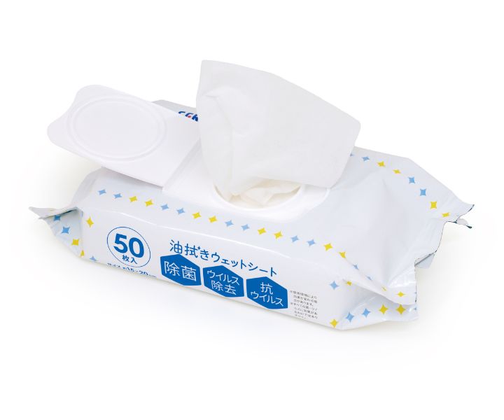 | 素材 | シート:不織布(パルプ、レーヨン、PET) 成分 :精製水、エタノール、グリコールエーテル 陰イオン系ナトリウム塩、除菌剤 |